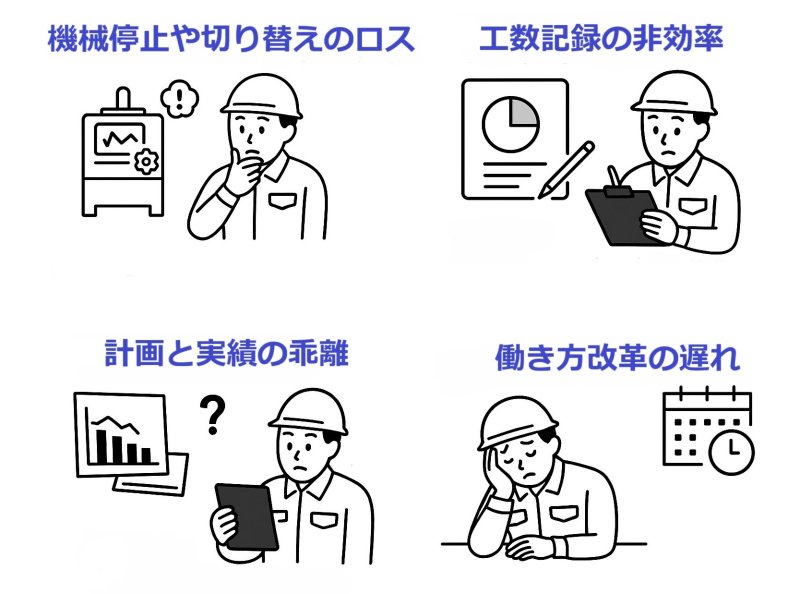 製造現場では、機械の異常対応や人員配置に時間がかかり、生産ロスが大きな課題です。加えて、安全確保や工数管理の精度向上も欠かせません。