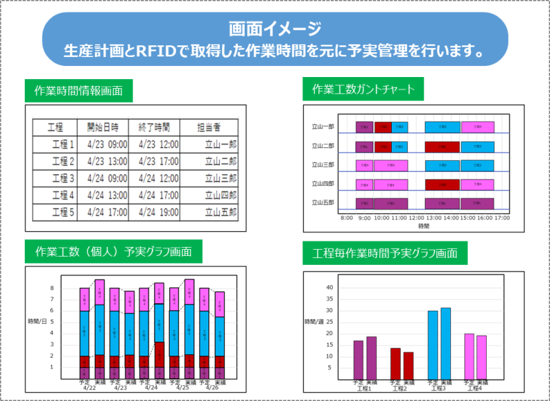 さらに、作業者が機械からはなれている時間などの情報などを活用し、生産計画に基づく予実管理を実現します。